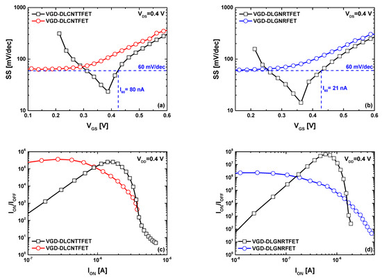 (a,b) Subthreshold swing versus the gate-to-source voltage, (c,d) ION/IOFF current ratio versus ION for VGD-DLCNT(T)FET (left figures) and VGD-DLGNR(T)FET (right figures).