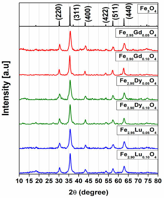 Powder XRD patterns at room temperature of substituted ferrites: [Fe3−xLnx]O4 with Ln = Gd (red line); Dy(green line); and Lu (blue line). Fe3O4 magnetite end-member showing the corresponding hkl Miller indices (black line).