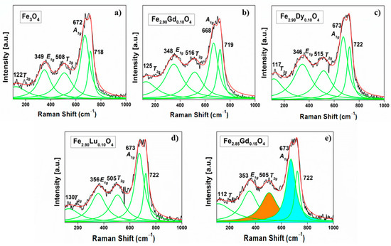 In Figure 3a, the spectrum for the magnetite Fe3O4 shows two signals, at 122 and 718 cm−1. The first one is also assigned by several authors [17,19,20] as one of the T2g mode, while the one that appears at 718 cm−1 is assigned as part of a structural disorder [21]. The ratio of A1g/T2g intensities, where the A1g signal (~670 cm−1, belonging to the tetrahedral site) and the T2g signal (~510 cm−1, belonging to the octahedral site) [21], for gadolinium-substituted Fe2.95Gd0.05O4, increases with respect to the proportions found in magnetite. This increase in intensity could be attributed to the preferential substitution of gadolinium in the structure in the tetrahedral site (Figure 3e). For the Fe2.90Gd0.10O4 phase, this ratio decreases, which could be due to the preferential distribution of Gd3+ in the octahedral site.