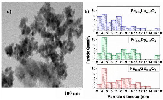 TEM and particle size distribution analysis. (a) Representative TEM image of Fe2.90Gd0.10O4 ferrite and (b) comparative histograms for ferrite (Fe2.90Ln0.10O4) particle sizes.