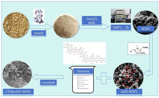 CTS@nZVI-WSPC: Mix 5 g of chitosan with 100 mL of acetic acid solution with a volume fraction of 5% at 25 °C and stir vigorously until the chitosan gel dissolves. Then, nZVI-WSPC was added with a mass ratio of chitosan: nZVI-WSPC (1:1), and continuous mechanical stirring for 4 h was used to obtain a uniform CTS@nZVI-WSPC mixture. Then, the mixed gel solution is sonicated in an ultrasonic bath for 30 min to obtain a homogeneous and dispersed chitosan gel solution with nZVI-WSPC particles. The prepared solution is lyophilized and dried for 28 h to obtain complexes. The final product is crushed and passed through a 100 mesh size (150 mm) for further use.