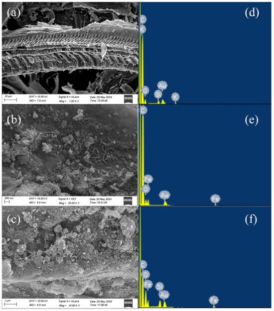 SEM and EDS image of three materials (a) SEM of WSPC; (b) SEM of nZVI-WSPC; (c) SEM of CTS@nZVI-WSPC; (d) EDS of WSPC; (e) EDS of nZVI-WSPC; (f) EDS of CTS@nZVI-WSPC.