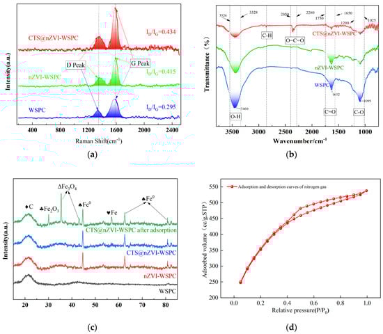 Characterization results of three materials: (a) The Raman analysis map; (b) FTIR curves; (c) XRD patterns; (d) N2 adsorption-desorption isotherms of CTS@nZVI-WSPC.