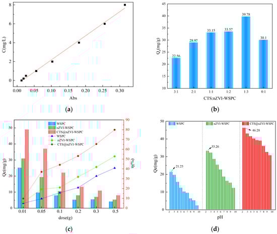 The standard curve for hexavalent chromium determination was shown in Figure 4a. A series of adsorbents synthesized from chitosan (CTS) and nZVI-WSPC with varying mass ratios were employed for the comparative adsorption of hexavalent chromium in aqueous solutions, and the results are presented in Figure 4b. As depicted in the figure, at a constant adsorbent mass (dose = 0.05 g), nZVI-WSPC exhibits a more pronounced impact on the adsorption of Cr (VI) in water compared to CTS alone. The composite materials demonstrated a higher adsorption capacity for Cr (VI) in water than nZVI-WSPC alone, reaching a maximum value of 39.78 mg/g at the mass ratio m(CTS):m(nZVI-WSPC) = 1:3. However, with a continuous increase in the CTS content, the adsorption capacity of the material gradually decreased. The modification of nZVI-WSPC by chitosan proved beneficial for the adsorption of Cr (VI) in water. Excessive CTS may impede the contact of nano-ZVI or biochar with hexavalent chromium, thereby reducing adsorption efficiency []. Based on the obtained experimental data, the optimal mass ratio of chitosan to nZVI-WSPC was determined to be 1:3, and this ratio was employed in subsequent experiments.