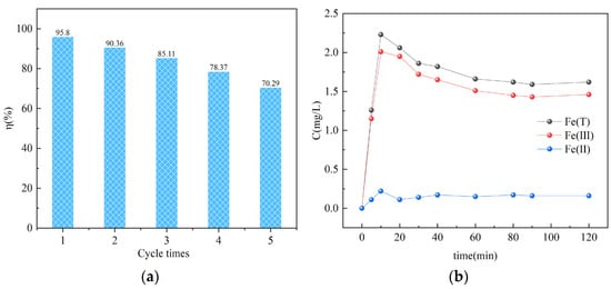 (a) Removal efficiency of CTS@nZVI-WSPC composite after five uses; (b) Changes in Fe concentrations during the reaction (condition: C0 = 50 mg/L, T = 25, t = 24 h, dose = 0.05 g, pH = 2).