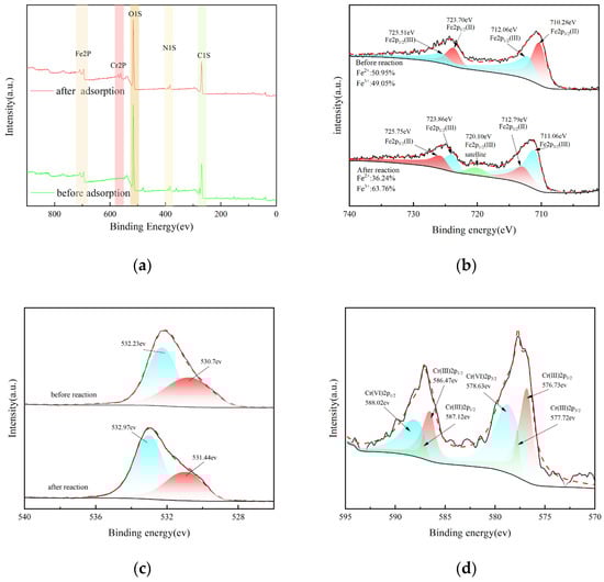 As shown in Figure 6c, the characteristic peaks of O1s appear at the 530.7 eV and 532.2 eV binding energies, respectively, indicating that oxygen exists mainly in the form of O2-and []. After the adsorption reaction, the two oxygen peaks experience a shift of about 0.7 eV; this shift indicates that the oxygen-active group participates in the redox reaction between Fe and Cr. The characteristic main peaks of Cr that appeared after the reaction correspond to 577 ev and 585 ev, respectively []. After peak division processing, we can see that the characteristic peaks of Cr (III) 2p3/2 orbit appear near 576.73 ev and 577.72 ev, and the characteristic peaks of Cr (III) 2p1/2 orbit appear near 586.47 ev and 586.12 ev, respectively. Moreover, the peak strength signal of trivalent chromium is relatively significant, indicating that the reduction of hexavalent chromium has occurred significantly (Figure 6d).