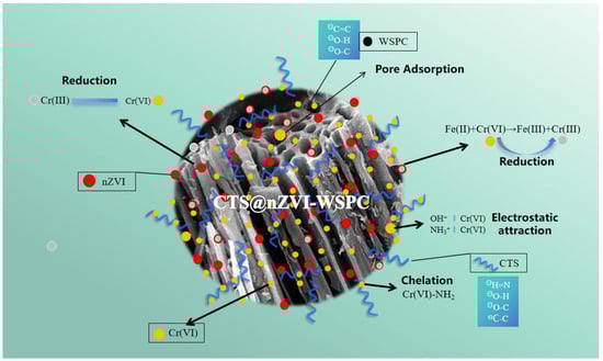 Based on the relevant experimental results and fitting analysis, we assert that CTS@nZVI-WSPC represents a novel green biomass-modified adsorption material. The adsorption mechanism targeting Cr (VI) in water is postulated to encompass pore adsorption, chemical reduction, chelation reactions, and electrostatic interactions [], as shown in Figure 7.