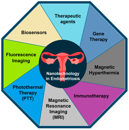 Nanotechnology, a domain of science and engineering focusing on nanoscale phenomena, is garnering significant global interest in the medical field. Numerous studies have indicated that nanoparticles (NPs) have the potential to augment traditional therapeutic methods, such as chemotherapy, and imaging techniques, like magnetic resonance imaging (MRI), for the detection (e.g., photoacoustic imaging) and treatment (e.g., photothermal therapy [PTT] and magnetic hyperthermia) of diverse diseases [1]. An overview of diverse applications of nanotechnology in addressing endometriosis is shown in Figure 1. Numerous investigations have demonstrated the potential of NPs to deliver anti-inflammatory, antioxidant, anti-angiogenic, or immunomodulating molecules to specific targets, leveraging their attributes of low toxicity, high stability, and the ability to conjugate with various biomolecules [2,3].