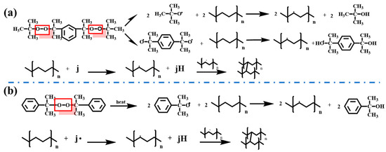 Reaction mechanism diagram of LDPE with crosslinking additives. (a) BIPB and LDPE; (b) DCP and LDPE.