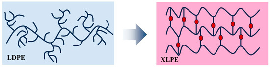 As shown in Figure 2, the crosslinking of LDPE using crosslinking additives converts the linear long chains of LDPE intertwined with each other into a three-dimensional mesh structure, and the crosslinking degree of the material increases. The increase in the degree of the crosslinking of the matrix and the formation of a three-dimensional network can increase the probability of the formation of thermal conductivity paths and a thermal conductivity network, so that the heat flow can be transferred along the filler, the thermal conductivity increases, the thermodynamic properties are improved [34], and the structure of the material will also affect the insulating properties of the material; with the increase in the degree of crosslinking and formation of the three-dimensional network, the material’s internal free volume decreases, the movement of polymer molecular chains are restricted, and electrical properties, such as volume resistivity, breakdown field strength, and others [35], will also be improved to a certain extent.