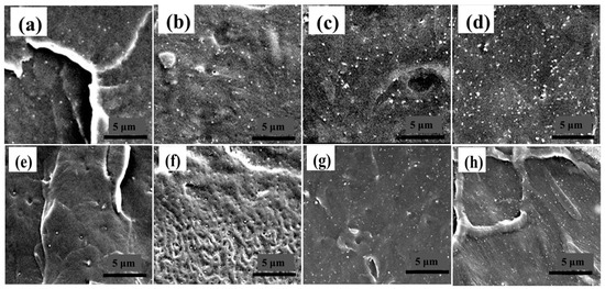 Cross-section SEM images of TS-1/XLPE-1 nanocomposites. (a) The 0.5 wt.% TS-1/XLPE-1 nanocomposite; (b) 1.0 wt.% TS-1/XLPE-1 nanocomposite; (c) 1.5 wt.% TS-1/XLPE-1 nanocomposite; (d) 2.0 wt.% TS-1/XLPE-1 nanocomposite; (e) 0.5 wt.% TS-1/XLPE-2 nanocomposites; (f) 1.0 wt.% TS-1/XLPE-2 nanocomposites; (g) 1.5 wt.% TS-1/XLPE-2 nanocomposites; (h) 2.0 wt.% TS-1/XLPE-2 nanocomposites.