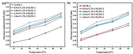 Thermal conductivity TS-1/XLPE-1 and TS-1/XLPE-2 nanocomposites. (a) TS-1/XLPE-1 nanocomposites; (b) TS-1/XLPE-2 nanocomposites.