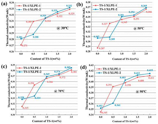 The thermal conductivity versus temperature curves of TS-1/XLPE nanocomposites containing different mass fractions of TS-1 nanofillers are shown in Figure 5. Crosslinked polyethylene nanocomposites are the key components of the insulation layer of power transmission cables, and their working temperature is not much different from the outside temperature, so generally not higher than 50 °C. However, with the prolongation of the working time, the internal heat of the cable cannot be dissipated in time, the temperature of the insulation layer will also rise, and in order to simulate the crosslinked polyethylene insulation materials in extreme conditions, the experimental testing process test temperature range is set to 30–90 °C.