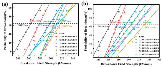 Breakdown field diagrams of crosslinked polyethylene and LDPE prepared by adding different crosslinking additives. (a) Breakdown field strength of DCP/LDPE; (b) BIPB/LDPEDCP/LDPE.