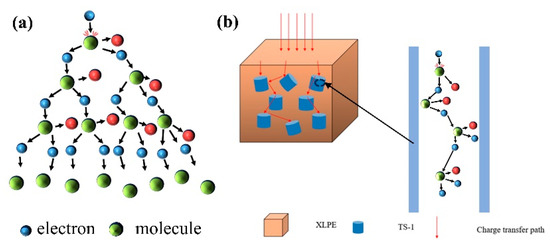 Schematic diagram of the mechanism of enhancement of breakdown field strength. (a) Schematic diagram of electron impact ionization conduction; (b) schematic diagram of the blocking effect of TS-1 on charge injection and transfer in XLPE matrix.