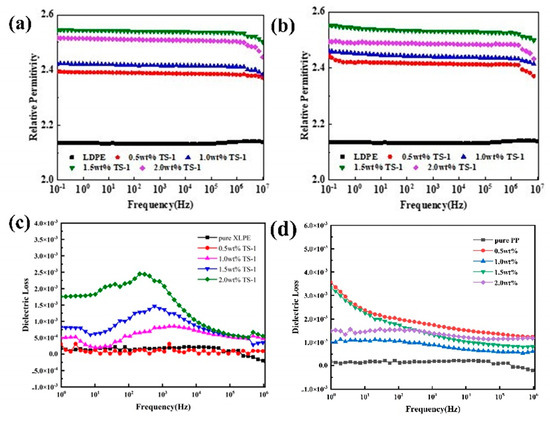 Dielectric constant with frequency curves of XLPE/TS-1 nanocomposites. (a) XLPE-1/TS-1 nanocomposites; (b) XLPE-2/TS-1 nanocomposites; curves of dielectric loss versus frequency for XLPE/TS-1 nanocomposites. (c) XLPE-1/TS-1 nanocomposite; (d) XLPE-2/TS-1 nanocomposite.