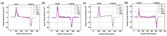 The space charge density of XLPE and TS-1/XLPE nanocomposites: (a) XLPE-1, (b) XLPE-2, (c) XLPE-1/1.5 wt.% TS-1, (d) XLPE-2/1.5 wt.% TS-1.
