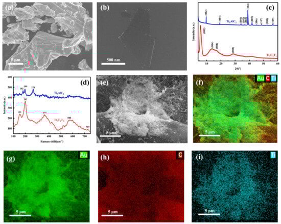 SEM of Ti3AlC2 (a) and monolayer Ti3C2Tx nanosheet (b). (c) XRD patterns of Ti3C2Tx and Ti3AlC2. (d) Raman signals of Ti3C2Tx and Ti3AlC2. (e) SEM of CS/Au/Ti3C2. Elemental mapping image of Au (g), C (h), Ti (i), and their overlay distribution (f).
