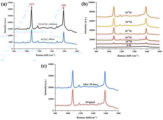 (a) SERS spectra of 10−7 M of 4-MBA on Au/Ti3C2 silicon and CS/Au/Ti3C2 substrates. (b) SERS spectra of different concentrations of 4-MBA measured by CS/Au/Ti3C2 substrate. (c) SERS spectra on CS/Au/Ti3C2 within 30 days.