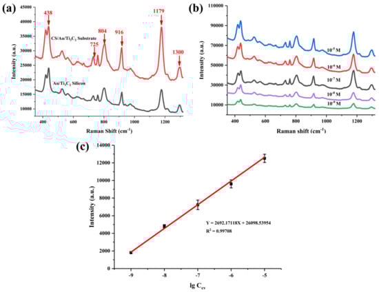 Similarly, CV was used to assay the SERS performance of CS/Au/Ti3C2. A similar situation occurred with the detection of CV. As shown in Figure 4a, the CS/Au/Ti3C2 substrate has better SERS performance than the Au/Ti3C2 silicon for CV detection. Fingerprint bands in the spectra of CV—corresponding to C–C bending modes at 1300 cm−1; aromatic C–H bending modes at 1179, 916, 804, and 725 cm−1; and C–N-C bending modes at 438 cm−1 are observed, which agree well with the literature data [10,13,24]. As shown in Figure S1, the full spectrum up to 3000 cm−1 exhibits the full range of fingerprint bands of the CV.