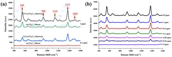 To explore the capability of CS/Au/Ti3C2 in in situ Raman detection, a common spray-shaped pesticide [26], thiram, was used as a target molecule. Figure 5a shows the SERS spectra for the detection of thiram at 1 ppm and 0.1 ppm on Au/Ti3C2 silicon and CS/Au/Ti3C2 substrates, respectively. The mode at 549 cm−1 is assigned to the S-S stretching mode. The mode near 1371 cm−1 is attributed to CH3 deformation and CN stretching. The modes at 1141 cm−1 and 1502 cm−1 are assigned to CN stretching and CH3 wagging modes [27], respectively. When the SERS substrate is Au/Ti3C2 silicon, the detection of 1 ppm of thiram has a lower marker band intensity, and the detection of 0.1 ppm of thiram makes it almost impossible to observe the marker bands. In contrast, when CS/Au/Ti3C2 was used as the SERS substrate, both concentrations showed significantly stronger marker bands than those of the silicon-based one. This means that CS/Au/Ti3C2 still shows much higher detection ability than silicon substate in the detection of thiram. The detection limit of CS/Au/Ti3C2 was evaluated by measuring Raman spectra of different concentrations of thiram in methanol solution from 0 to 10 ppm. The results showed that the marker bands of thiram could still be detected even at concentrations as low as 0.01 ppm (SNRthiram = 15.56) (Figure 5b).