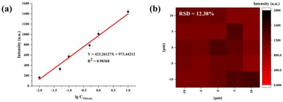 The linear relationship between the concentration of thiram and the mode intensity of the characteristic peak and the spatial homogeneity were used to assess the SERS performance of CS/Au/Ti3C2 substrate. Similar to that in the detection of CV, a linear fit was performed using the lg Cthiram and the marker band intensity of thiram located at 1371 cm−1. As shown in Figure 6a, a good linear correlation (R2 = 0.98368) was established by plotting the log values of the SERS intensity and thiram concentration. In the evaluation of spatial uniformity, a 20 μm × 20 μm area on the CS/Au/Ti3C2 substrate was taken for SERS detection at 25 spots. The hotspot mapping is shown in Figure 6b, and the spatial homogeneity of the region was evaluated by relative standard deviation (RSD). The results showed that the RSD = 12.38% and the CS/Au/Ti3C2 had good spatial homogeneity.