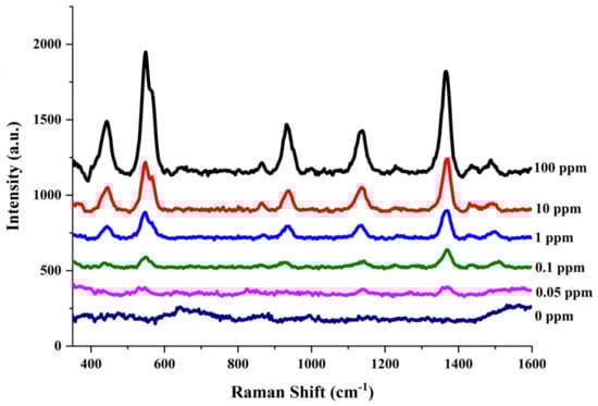 Further experiments were conducted to investigate whether the CS/Au/Ti3C2 flexible substrate prepared in this paper can be used for the detection of pesticide residues on crop surfaces by simple wiping. Briefly, the CS/Au/Ti3C2 substrate was moistened with a methanol solution and fully wiped on the surface of apples containing dried pesticide residues, waiting for the CS/Au/Ti3C2 to completely dry for SERS detection. The concentrations of thiram pre-sprayed on the apple surface were 100 ppm, 10 ppm, 1 ppm, 0.1 ppm and 0.05 ppm. The experimental results are shown in Figure 7, where CS/Au/Ti3C2 still reached the limit of detection, 0.05 ppm, with the simple wipe sampling method. The limit of detection was calculated to be 0.05 ppm, which is well below the maximum residue limit (MRL) in fruit of 7 ppm set by the U.S. Environmental Protection Agency (EPA). Therefore, the CS/Au/Ti3C2 flexible substrate is expected to be used for rapid and sensitive SERS detection of residue on the fruit surface.