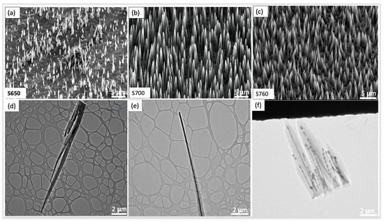 The FESEM images in Figure 1a–c reveal the effect of different growth temperatures on the morphology and density of the VACNT arrays. In Figure 1a, sparsely grown VACNTs of non-uniform height (between 0.4 and 10 , diameter (between 300 and 670 nm), and inter-tube spacings can be observed, some of which appear in bundles. The poor growth, non-uniformity, and bundled nature of these VACNTs can be attributed to the fact that the growth temperature (650 °C) was insufficient to break the surface of the Cu substrate into uniform and distinct nanosized islands for CNT growth. In addition, 650 °C may not be high enough to sufficiently dissociate the C2H2 into carbon atoms, leading to insufficient carbon species for further dissolution into the available nano islands. At a much higher synthesis temperature of 700 °C, the VACNTs appear as freestanding uniform VACNTs with average diameter and height of 940 nm and 14 , respectively (Figure 1b). At 760 °C (Figure 1c), the average diameter of the VACNTs was measured as 1.2 . Interestingly, the CNTs were slightly shorter than the S700 samples, with an average height of 8.5 . This might be attributed to the excessive carbon deposition at a higher temperature, which caused early growth termination. Also, most CNTs appear as bundles due to Ostwald ripening, which causes individual nanoparticles to coalesce and form bigger ones. As a result, numerous individual VACNTs grow from these bigger but single catalyst sites to form bundles [62].