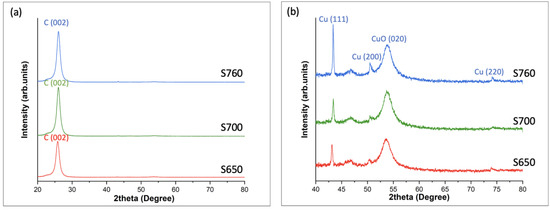 XRD patterns of the S650, S700, and S760 samples. (a) shows the peak of the graphitic carbon layers, and (b), zoom-in of (a), shows the peaks of different Cu crystals encapsulated inside the VACNTs.