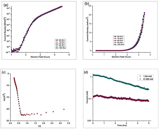 Graph of emission current density vs. applied electric field (J vs. E plot) of the S700 sample, (a) semi-log and (b) linear scale. (c) Fowler–Nordheim (F-N) plot of the S700 sample. (d) Stability test of the S700 sample at initial currents of 0.108 mA and 1.04 mA.