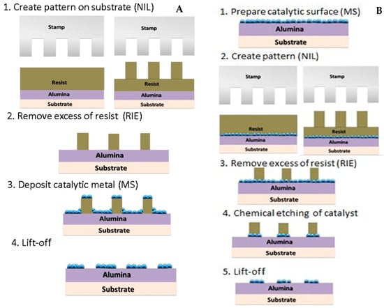 The basic scheme of steps required to prepare the patterned catalyst is presented in Figure 1. Silicon (Si) substrate was used to deposit alumina coating as the base layer on which the resist materials were coated. The procedure includes processes of: resist spin-coating and imprint; plasma etching to remove the residual layer of resist and open substrate surface; deposition of alumina and catalytic metal; chemical etching of catalyst metal; and the final step of lift-off of thermal resist residue. Depending on the sequence of steps, the positive or negative replica of the master–stamp (mold) pattern can be replicated. To achieve repeatable results, each process step was optimized [].