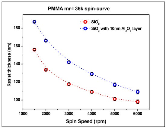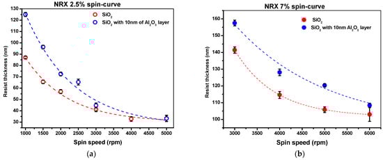 The thermal mode of Nanonex 2000 nanoimprint lithographer was used to create a pattern on the substrate. The following thermal resist solutions were used: two solutions supplied by Nanonex—NRX1025 2.5% and 7%, and PMMA mr-35k from Sigma Aldrich. In order to determine the influence of the alumina layer on resist thickness, the resists NRX1025 2.5% and 7% and PMMA mr-I 35k were spin-coated on Si substrate and on 10 nm alumina layer deposited by RF sputtering with a roughness of Ra = 0.2 nm. The resists were spin-coated at various speeds from 2000 rpm to 6000 rpm, and the substrates were baked on a hot plate at 150 °C for 5 min to remove the residue of solvent. The thickness of the resist was measured by the XRD technique and profilometer. The spin-curves of NRX1025 2.5% and 7% solutions are presented in Figure 4 and Figure 5, respectively. Figure 4 presents the spin-curve for PMMA mr-35k thermal resist on pure Si substrate and on substrate with 10 nm of alumina layer.