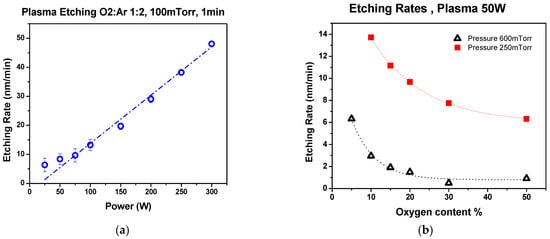 Reactive plasma etching (PE-100, PlasmaEtch, Carson City, NV, USA) was used to reduce the thickness of the spin-coated films for catalyst deposition. The effects of gas pressure, applied power, and oxygen content in the reactive gas mixture were evaluated.