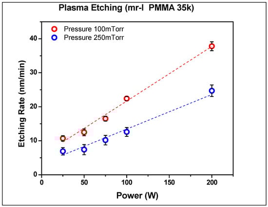 The etching rates for thermal resist were determined by measuring the thickness of spin-coated films using XRD methods on the imprinted samples using AFM. The effects of pressure, applied power, and oxygen content in the reactive gas mixture were evaluated. As seen in Figure 7 and Figure 8, the etching rate of thermal resist is directly proportional to the applied power and inversely proportional to pressure. Increasing the oxygen content resulted in lower etching rates, as was observed by Hartney, Greene []. The PMMA resist has a lower etching rate than the NRX1025. These etching rates have an impact on the amount of resist being deposited during the spin coating stage for either negative or positive resist material types. Negative photoresists harden after exposure to UV light whereas positive photoresists soften after exposure to UV light []. Negative photoresists provide good adhesion to the substrate at a lower cost with shorter processing times. However, positive photoresists have higher resolution and thermal stability. In this research, we utilized thermal NIL in which both PMMA and NRX1025 resists hardened after crosslinking due to elevated temperatures.