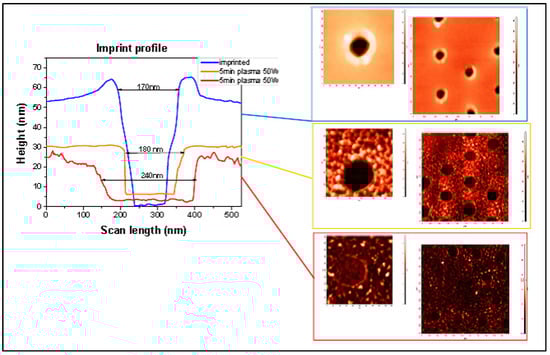 The AFM scans of imprinted and etched samples reveal the additional effect of the plasma etching process on the resist. As seen in Figure 9, the resist undergoes extra curing under plasma, wherein the polymer chain undergoes cross-linkage and becomes clearly visible. The over-curing and cross-linkage of resist were found undesirable for the lift-off process of further sample processing.