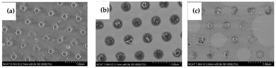 The AFM and SEM analyses of plasma-etched samples confirm that the process is unidirectional, and in order to maintain the desired planar size of the pattern, it should be minimized. The other undesirable effect of the plasma etching process was revealed by observing large areas of processed samples in the spots where the charge accumulated, and local charge breakthrough occurred (Figure 10c). To avoid the negative effects of the plasma process, the etching should be conducted at the lowest possible pressure and power for a short duration of time. Thus, near-zero residual layer imprint processes are highly desired.