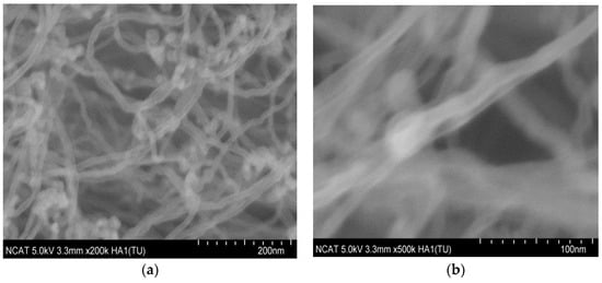HR-SEM images of individual CNTs in array at (a) 200k and (b) 500k magnifications.