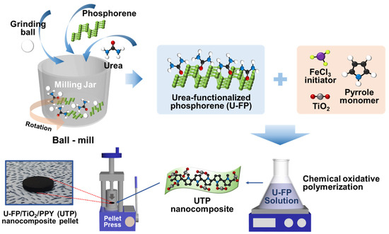 The UTP nanocomposite for the antenna electrode application was fabricated via mechanochemical ball milling, chemical oxidative polymerization, and mechanical pelletizing processes, as depicted in Figure 1. First, urea-functionalized phosphorene (U-FP) was synthesized via mechanochemical ball milling of phosphorene with urea. Ball milling is a suitable method for introducing urea functional groups into phosphorene nanosheets under high-temperature and high-pressure conditions.