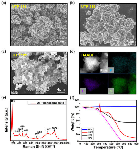 (a–c) FE-SEM image of UTP 111, UTP 119, and UTP 191. (d) HAADF-STEM image and EDS elemental mapping images of the UTP nanocomposite. (e) Raman spectra of the UTP nanocomposite. (f) TGA curves of the UTP nanocomposite, U-FP, TiO2, and PPY.