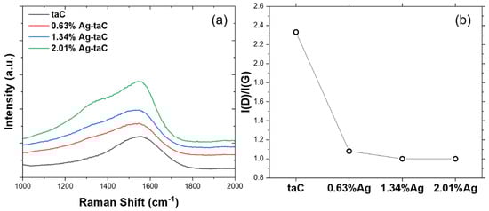 Raman spectra of Ag-taC coatings (a); and I(D)/I(G) ratio (b).