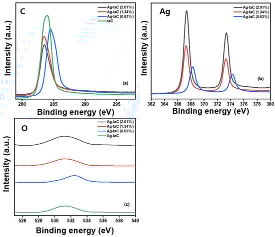 XPS spectra of the taC and Ag-taC coatings demonstrating the typical binding energy for C (a), Ag (b), and O (c).