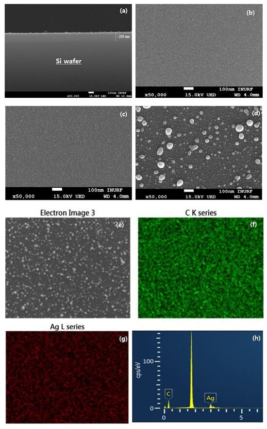 SEM data of Ag-taC coatings with representative sputtering power of 30 W, 50 W, and 70 W with a coating thickness 200 nm on Si wafer (a) 0.63 at. %, (b) 1.34 at. %, (c) 2.01 at. %, (d) Ag-taC were deposited on Si-wafer and prepared by cross-sectional cutting. (e) SEM with EDS data of Ag-taC (2.01 at. %) film showed the distribution of Ag-taC, predominantly. (f) EDS mapping showed carbon, (g) Ag, and (h) level of element percentage.