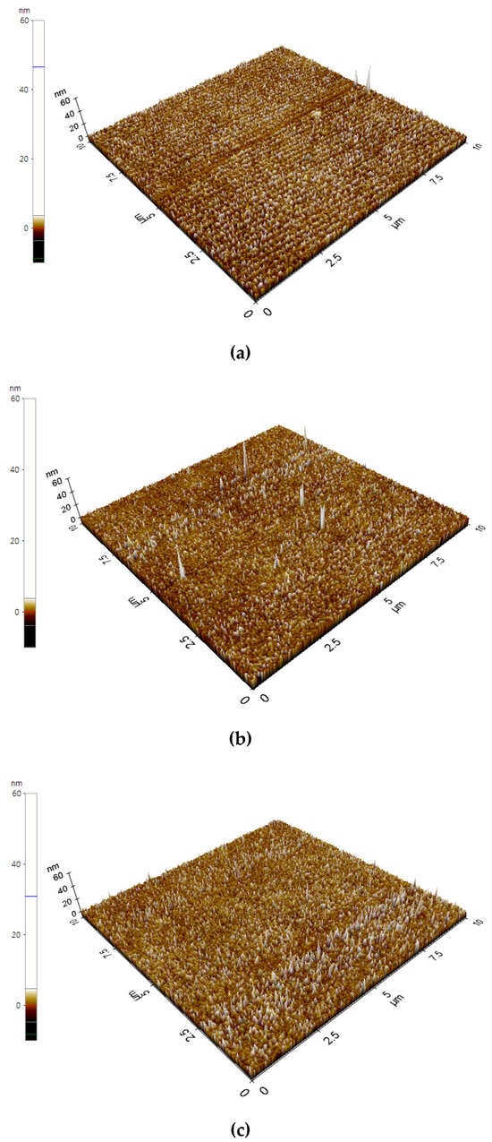 AFM showed surface roughness images of Ag-taC coatings 0.63 (at. %) (a), 1.34 (at. %) (b), and 2.01 (at. %) (c) with their average roughness (Ra) and root mean square (RMS) calculated as 1.4 nm and 1.89, 1.3 nm and 2.0, and 1.7 nm, and 2.4, respectively.