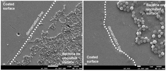 To support the evidence of biofilm inhibition on the surface of Ag-taC coatings, it was investigated using SEM studies (Figure 8). The demarcation line was clearly visible at the lowest magnification between the coated and uncoated surfaces. On the uncoated surface, 97% of the area was covered with biofilm caused by S. aureus (Figure 8a). Although the biofilm inhibition study was initiated with S. aureus and P. aeruginosa, the SEM study was focused only on S. aureus since the organism is considered a potential biofilm-forming bacterial pathogen and causes severity in hospital-related diseases such as nosocomial infection. It also develops multi-drug resistance []. At the highest magnification, S. aureus established an apparent growth on the uncoated surface by developing extracellular polymeric substances (EPS). The S. aureus mostly appears to be spherical, with a clump of cells. It is significant evidence that the cells are not only growing on the coated surfaces but also near the demarcation line on the uncoated surface, indicating that the effect of Ag-taC did not allow any cells to adhere near the coated surface (Figure 8b). This result corroborates with Streletskiy et al., who stated that bacterial adhesion differs with taC film coatings doped with Ag and N2 []. They found that bacterial proliferation was observed in taC: N coatings and found a gradual decrement in the bacterial population. It is stated that bacterial biofilm develops resistance to prosthetics and medical treatment and gradually decreases immunity [].