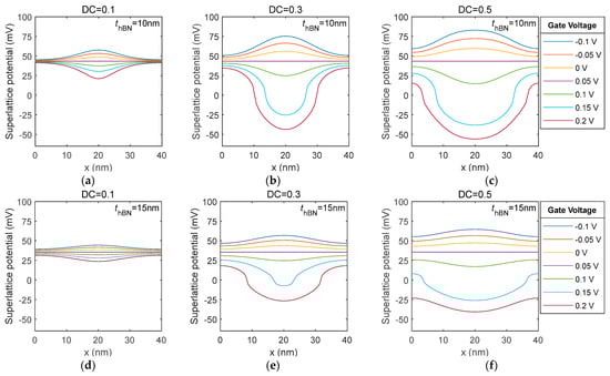 The SL potential can then be obtained with Equation (1). To reveal the SL potential distribution straightforwardly, a line-cut is performed along the white dotted line in Figure 2b. The results show that the thickness of the hBN layer, the duty cycle and the gate voltage all affect the potential distribution of the superlattice, as shown in Figure 3. When the duty cycle is 0.1, the potential distribution is unipolar for both hBN thicknesses. At higher duty cycles (0.3, 0.5), the potential distribution is bipolar when the gate voltage is around three times the balance potential (0.15 V). Therefore, for the tunable superlattice, the potential distribution of the superlattice can be actively designed by setting the duty cycle and the gate voltage.