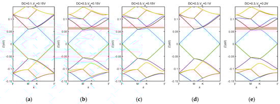 For low-energy situations, it is possible to achieve the convergence when truncating the infinite large matrix with []. The Eigen energies of the GSL can then be obtained by diagonalizing . The GSL discussed here is the same one as mentioned in Section 3.1. The band structures of the GSL at different gate voltages and duty cycles are displayed in Figure 3. It is interesting to see that a bandgap is present at the secondary Dirac Point around 60 meV at K point. At a fixed gate voltage, the band gap first opens up and then drops down when the duty cycle is increased (Figure 4a–c, highlighted by red in the figures). At a fixed duty cycle, this band gap is broadened when the gate voltage is increased (Figure 4b,d,e).
