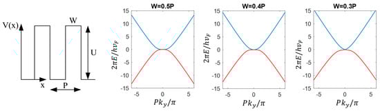 For a 1-dimensional tunable GSL, where the electric potential varies periodically along one axis only, as expected, the duty cycle (the ratio between the barrier width W and period P of the SL potential, Figure 5) affects the symmetry of the band structures. As shown in Figure 5, the band structures of a 1-dimensional tunable GSL at three different duty cycles are calculated with the method reported in reference []. It is interesting to see that a flat band appears at the K point when the superlattice potential is u = UP/VFℏ = 4π, where U is the barrier height, VF is the fermi velocity and ℏ is the reduced Planck constant. At the duty cycle of 0.5, the conduction band and the valence band are symmetric. As the duty cycle decreases, the two bands become asymmetric.