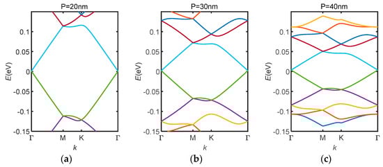 Electronic band structure for GSLs with different periods (P is the superlattice period): (a) P = 20 nm; (b) P = 30 nm; (c) P = 40 nm. Lines with different colours correspond to different eigen values of the SL Hamiltonian.