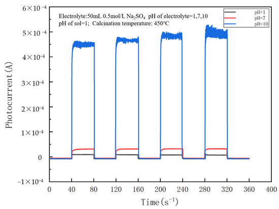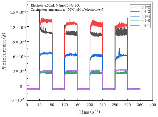 Effect of electrolyte pH on the photocurrent of a NO3−/TiO2 thin-film electrode. (The calcination temperature is 450 °C, and the solution is pH = 1 during sol–gel preparation).