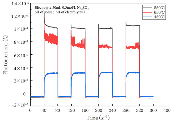 As shown in Figure 3, the photocurrent of the TiO2 electrode is the largest when the calcination temperature is 550 °C, which is about A. The photocurrents of TiO2 calcined at 550 °C and 650 °C are both much larger than those at 450 °C, which are 2.5~3 times larger. But, when the temperature is >550 °C, the photocurrent is weakened with an increase in the temperature. More impressively, the anatase-type titanium dioxide begins to convert to rutile when the temperature rises to 550 °C, and the proportion of rutile type gradually increases with an increase in the temperature. This property of TiO2 can be applied to explain why the magnitude of photocurrents varies with the calcination temperature. This suggests that the TiO2 samples contain a certain amount of the rutile phase at 550 °C and 650 °C, which indicates that the existence of a certain proportion of the rutile phase to form mixed crystals can significantly enhance photocurrents compared with the pure anatase type.